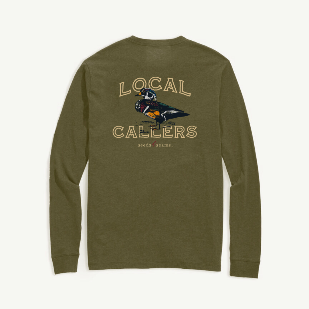 Be stylish and comfortable with LOCAL CALLERS, featuring a Wood Duck design and New Olive Green Tee. Perfect for any fall event!